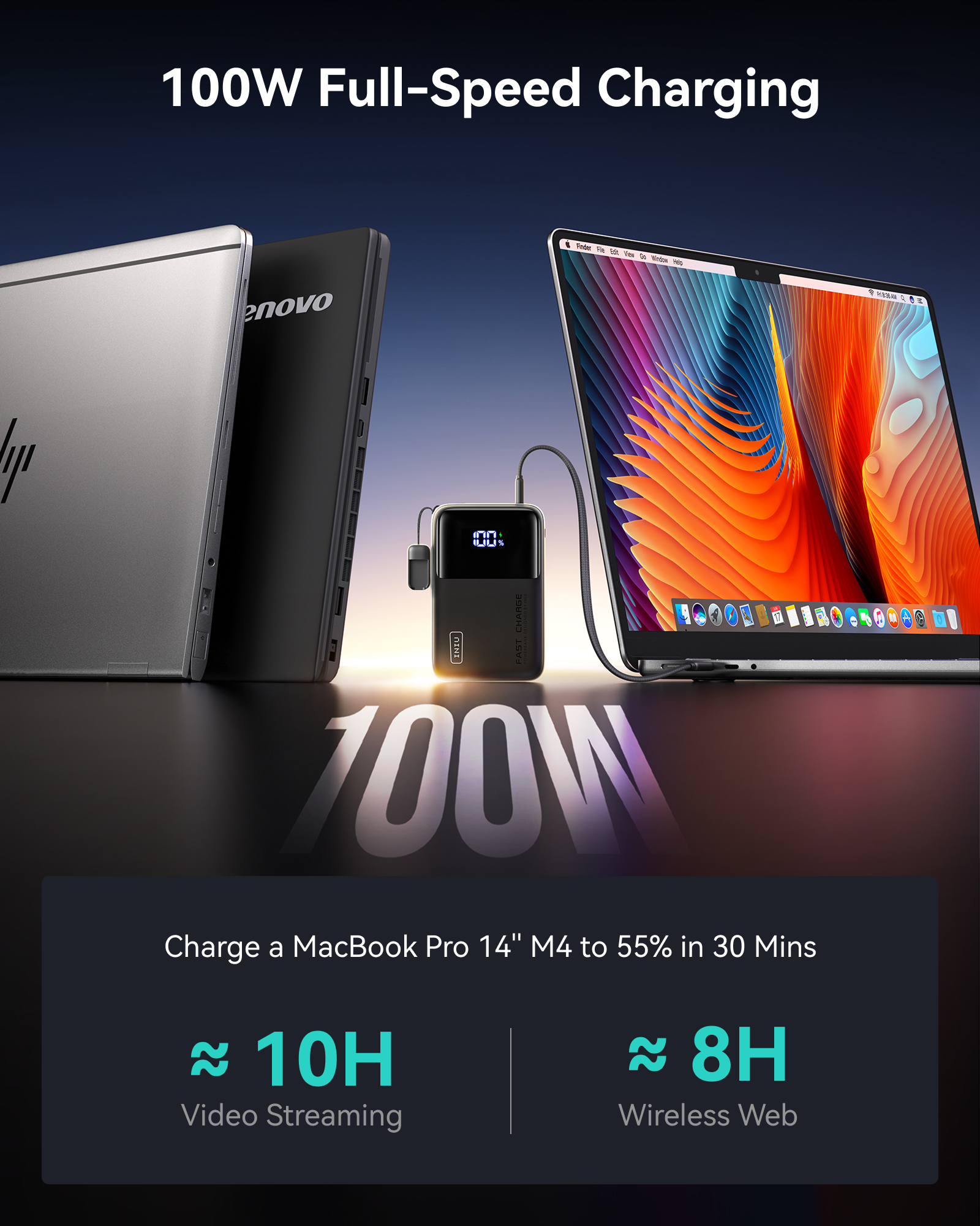 Peace of mind for long trips. This power bank features enormous 25,000mAh capacity for worry-free weeklong use, and 100W super fast charging to get your devices ready in minutes (even laptops). Best of all, its revolutionary 30% smaller size means you can take this powerhouse anywhere, without the bulk! - Who it’s for: