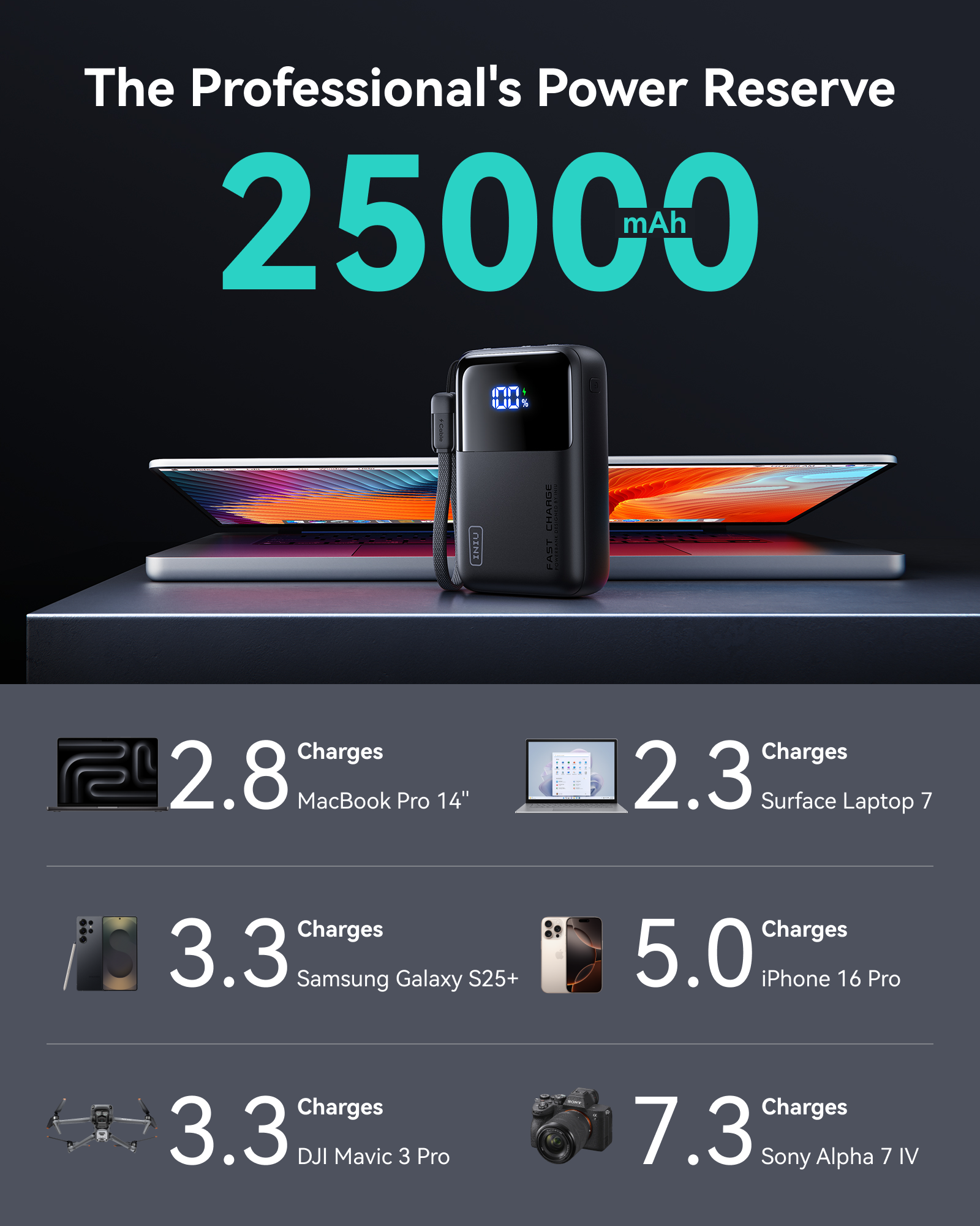 Heavy users like travelers, photographers, and creators who need reliable, fast, and portable power. Perfect for long trips, outdoor adventures, or anywhere outlets are scarce. - 25,000mAh Capacity